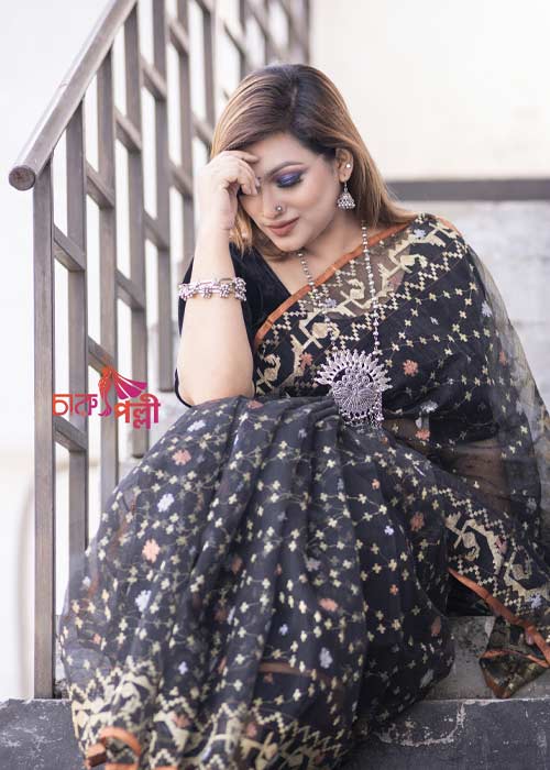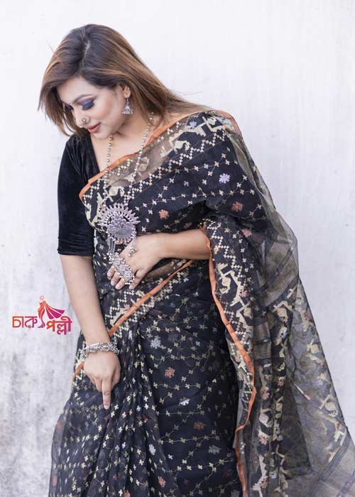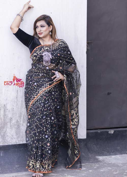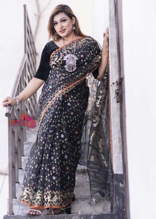 Timeless beauty in every fold! Adorn yourself in the captivating allure of Charu pallis saree. Immerse yourself in the exquisite beauty of the Dhakai Jamdani saree, a true icon of Bangladeshi heritage. Handwoven with meticulous precision, each saree showcases intricate patterns and delicate motifs, often inspired by nature and traditional designs. The fine craftsmanship and luxurious fabric make the Dhakai Jamdani a coveted choice for special occasions and everyday elegance