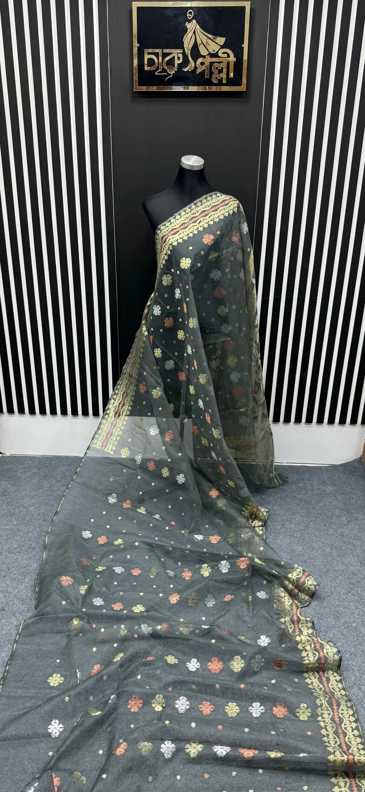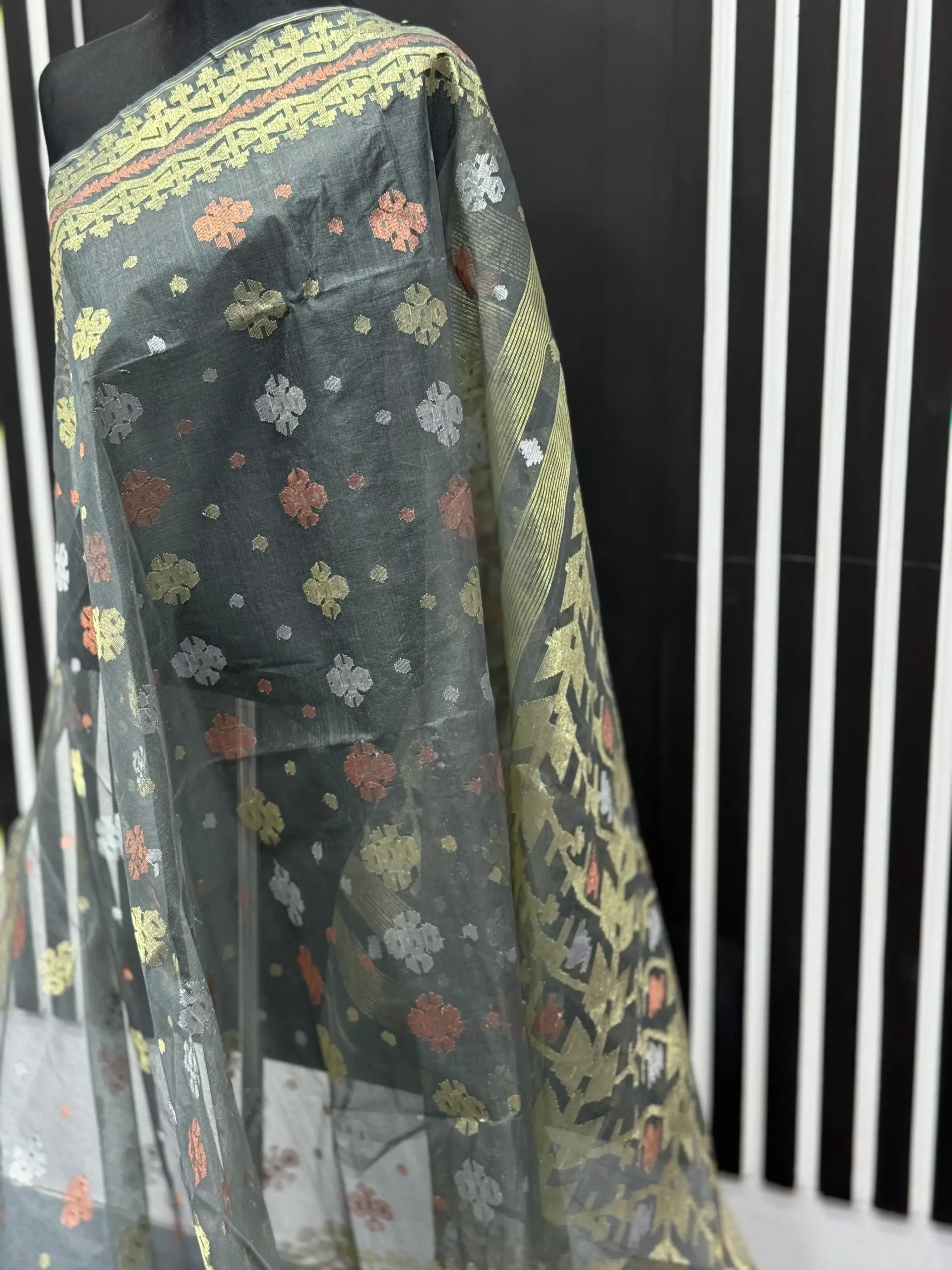 Timeless beauty in every fold! Adorn yourself in the captivating allure of Charu pallis saree. Immerse yourself in the exquisite beauty of the Dhakai Jamdani saree, a true icon of Bangladeshi heritage. Handwoven with meticulous precision, each saree showcases intricate patterns and delicate motifs, often inspired by nature and traditional designs. The fine craftsmanship and luxurious fabric make the Dhakai Jamdani a coveted choice for special occasions and everyday elegance. Metarial 👉 84 count. Half silk Color 👉 Olive Blouse 👉Yes with blouse Care 👉 Only katawash( Do it by Tati)