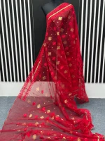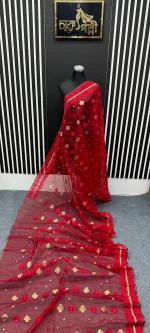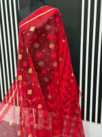 Timeless beauty in every fold! Adorn yourself in the captivating allure of Charu pallis saree. Immerse yourself in the exquisite beauty of the Dhakai Jamdani saree, a true icon of Bangladeshi heritage. Handwoven with meticulous precision, each saree showcases intricate patterns and delicate motifs, often inspired by nature and traditional designs. The fine craftsmanship and luxurious fabric make the Dhakai Jamdani a coveted choice for special occasions and everyday elegance. Metarial 👉 84 count. Half silk Color 👉 Paste Blouse 👉Yes with blouse Care 👉 Only katawash( Do it by Tati)