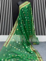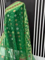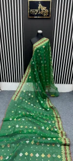 Timeless beauty in every fold! Adorn yourself in the captivating allure of Charu pallis saree. Immerse yourself in the exquisite beauty of the Dhakai Jamdani saree, a true icon of Bangladeshi heritage. Handwoven with meticulous precision, each saree showcases intricate patterns and delicate motifs, often inspired by nature and traditional designs. The fine craftsmanship and luxurious fabric make the Dhakai Jamdani a coveted choice for special occasions and everyday elegance. Metarial 👉 84 count. Half silk Color 👉 Green Blouse 👉Yes with blouse Care 👉 Only katawash( Do it by Tati)