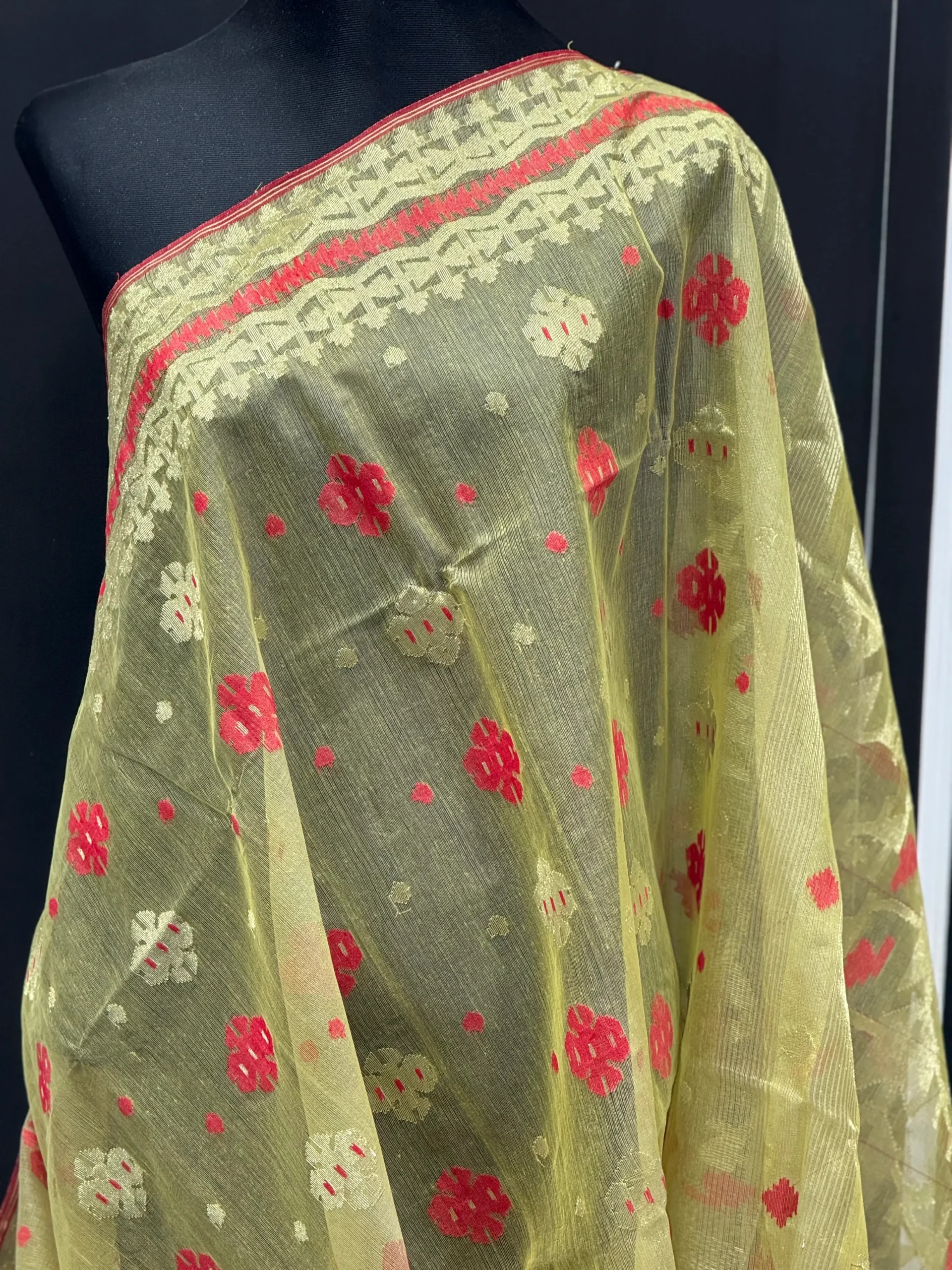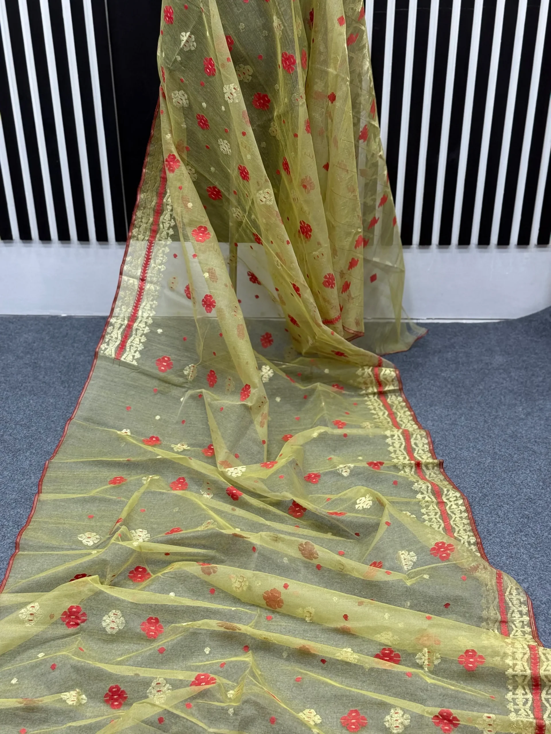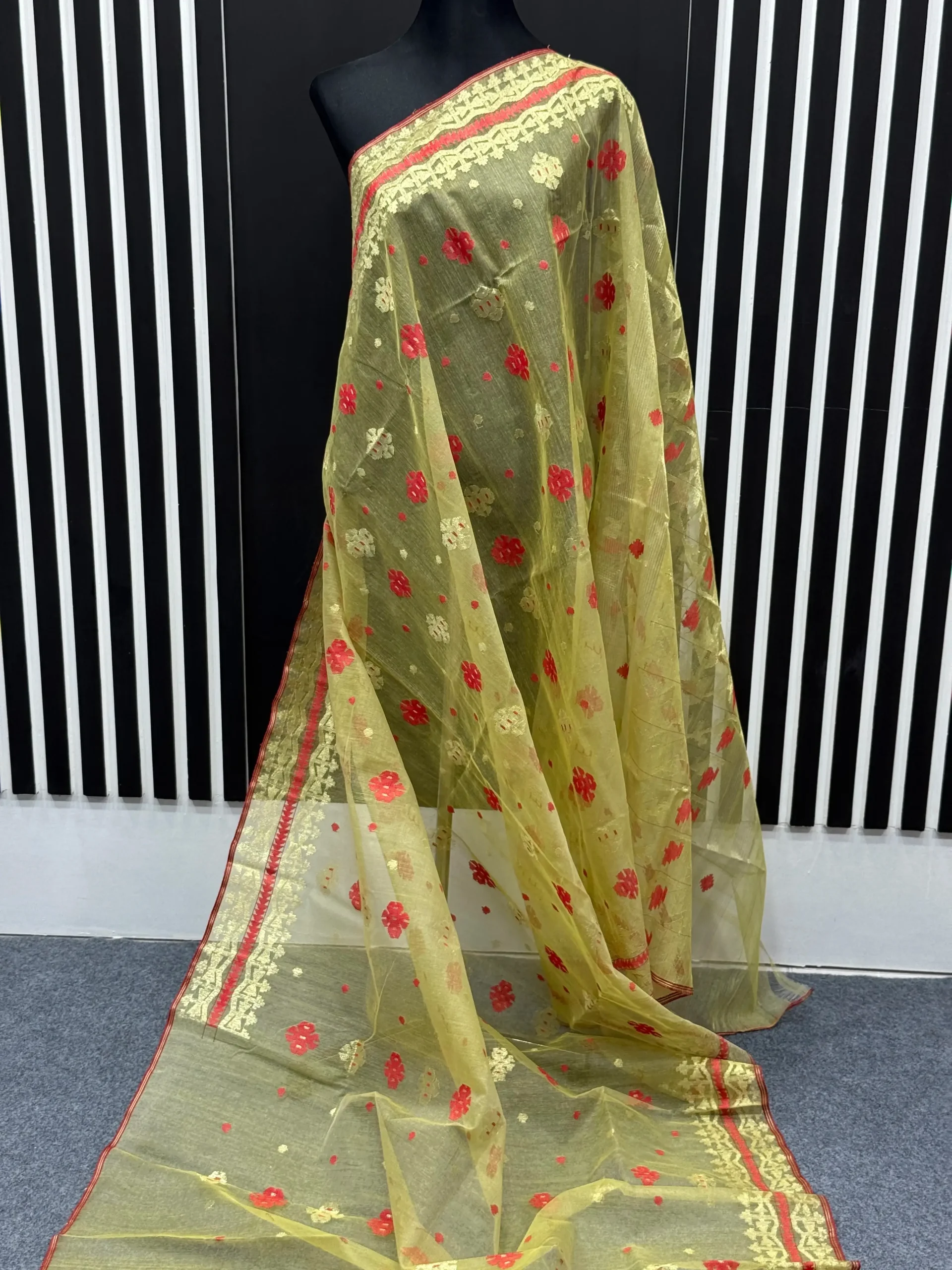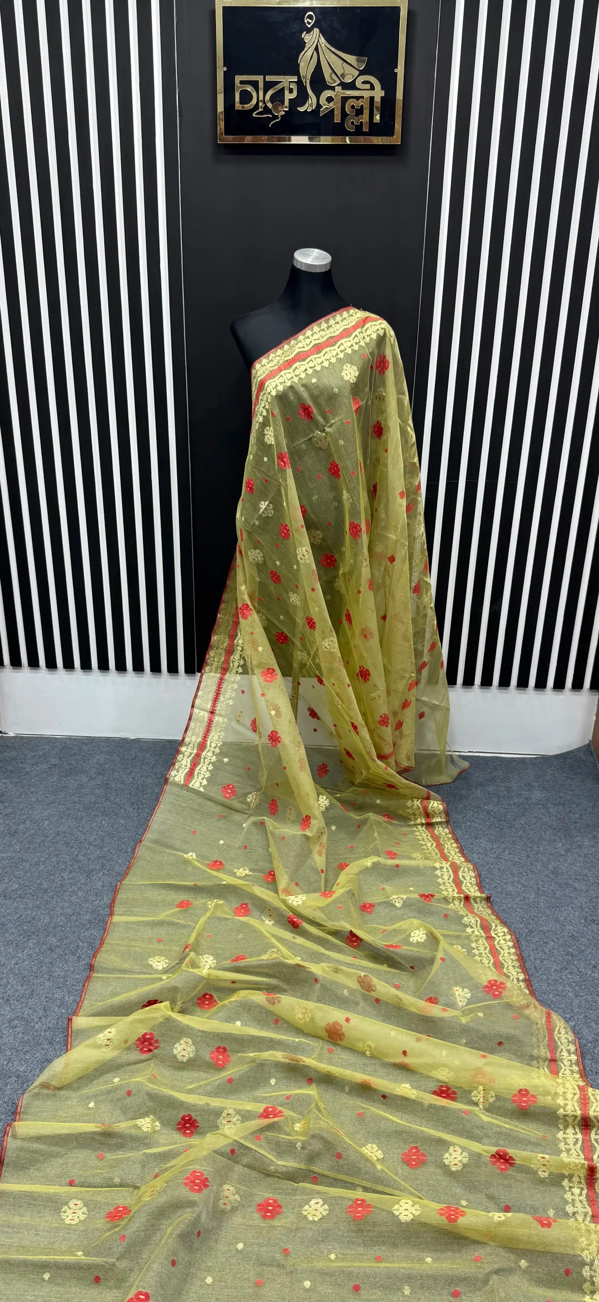 Timeless beauty in every fold! Adorn yourself in the captivating allure of Charu pallis saree. Immerse yourself in the exquisite beauty of the Dhakai Jamdani saree, a true icon of Bangladeshi heritage. Handwoven with meticulous precision, each saree showcases intricate patterns and delicate motifs, often inspired by nature and traditional designs. The fine craftsmanship and luxurious fabric make the Dhakai Jamdani a coveted choice for special occasions and everyday elegance. Metarial 👉 84 count. Half silk Color 👉 Olive Blouse 👉Yes with blouse Care 👉 Only katawash( Do it by Tati)