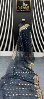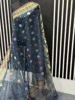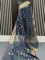 Timeless beauty in every fold! Adorn yourself in the captivating allure of Charu pallis saree. Immerse yourself in the exquisite beauty of the Dhakai Jamdani saree, a true icon of Bangladeshi heritage. Handwoven with meticulous precision, each saree showcases intricate patterns and delicate motifs, often inspired by nature and traditional designs. The fine craftsmanship and luxurious fabric make the Dhakai Jamdani a coveted choice for special occasions and everyday elegance. Metarial 👉 84 count. Half silk Color 👉 Ash Blouse 👉Yes with blouse Care 👉 Only katawash( Do it by Tati)