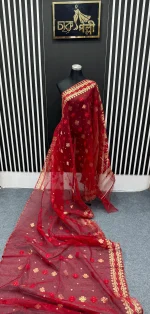 Timeless beauty in every fold! Adorn yourself in the captivating allure of Charu pallis saree. Immerse yourself in the exquisite beauty of the Dhakai Jamdani saree, a true icon of Bangladeshi heritage. Handwoven with meticulous precision, each saree showcases intricate patterns and delicate motifs, often inspired by nature and traditional designs. The fine craftsmanship and luxurious fabric make the Dhakai Jamdani a coveted choice for special occasions and everyday elegance. Metarial 👉 84 count. Half silk Color 👉 White Blouse 👉 Yes with blouse Care 👉 Only katawash( Do it by Tati)