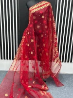 Timeless beauty in every fold! Adorn yourself in the captivating allure of Charu pallis saree. Immerse yourself in the exquisite beauty of the Dhakai Jamdani saree, a true icon of Bangladeshi heritage. Handwoven with meticulous precision, each saree showcases intricate patterns and delicate motifs, often inspired by nature and traditional designs. The fine craftsmanship and luxurious fabric make the Dhakai Jamdani a coveted choice for special occasions and everyday elegance. Metarial 👉 84 count. Half silk Color 👉 Paste Blouse 👉Yes with blouse Care 👉 Only katawash( Do it by Tati)