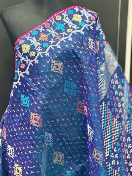 Timeless beauty in every fold! Adorn yourself in the captivating allure of Charu pallis saree. Immerse yourself in the exquisite beauty of the Dhakai Jamdani saree, a true icon of Bangladeshi heritage. Handwoven with meticulous precision, each saree showcases intricate patterns and delicate motifs, often inspired by nature and traditional designs. The fine craftsmanship and luxurious fabric make the Dhakai Jamdani a coveted choice for special occasions and everyday elegance. Metarial 👉 84 count. Half silk Color 👉 Duel Tone Magenta X Maroon Blouse 👉Yes with blouse Care 👉 Only katawash( Do it by Tati)