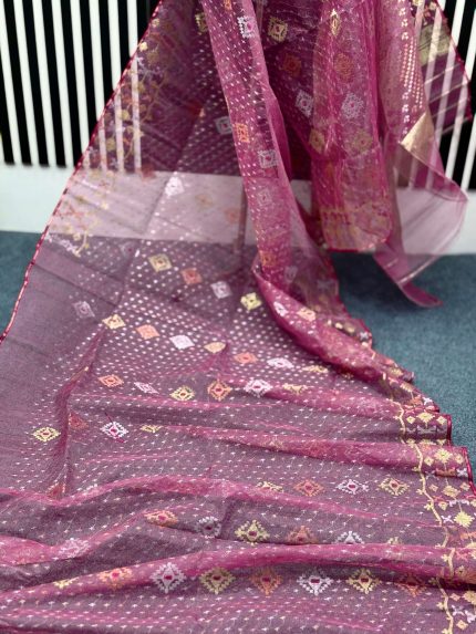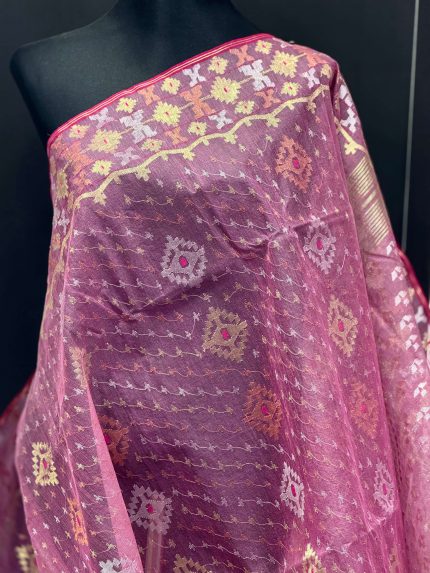 Timeless beauty in every fold! Adorn yourself in the captivating allure of Charu pallis saree. Immerse yourself in the exquisite beauty of the Dhakai Jamdani saree, a true icon of Bangladeshi heritage. Handwoven with meticulous precision, each saree showcases intricate patterns and delicate motifs, often inspired by nature and traditional designs. The fine craftsmanship and luxurious fabric make the Dhakai Jamdani a coveted choice for special occasions and everyday elegance. Metarial 👉 84 count. Half silk Color 👉 Baby Pink Blouse 👉 Yes with blouse Care 👉 Only katawaah( Do it by Tati)