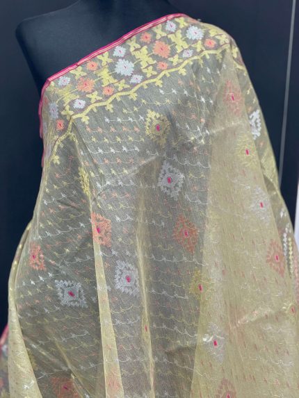 Timeless beauty in every fold! Adorn yourself in the captivating allure of Charu pallis saree. Immerse yourself in the exquisite beauty of the Dhakai Jamdani saree, a true icon of Bangladeshi heritage. Handwoven with meticulous precision, each saree showcases intricate patterns and delicate motifs, often inspired by nature and traditional designs. The fine craftsmanship and luxurious fabric make the Dhakai Jamdani a coveted choice for special occasions and everyday elegance. Metarial 👉 84 count. Half silk Color 👉 Golden Blouse 👉Yes with blouse Care 👉 Only katawaah( Do it by Tati)