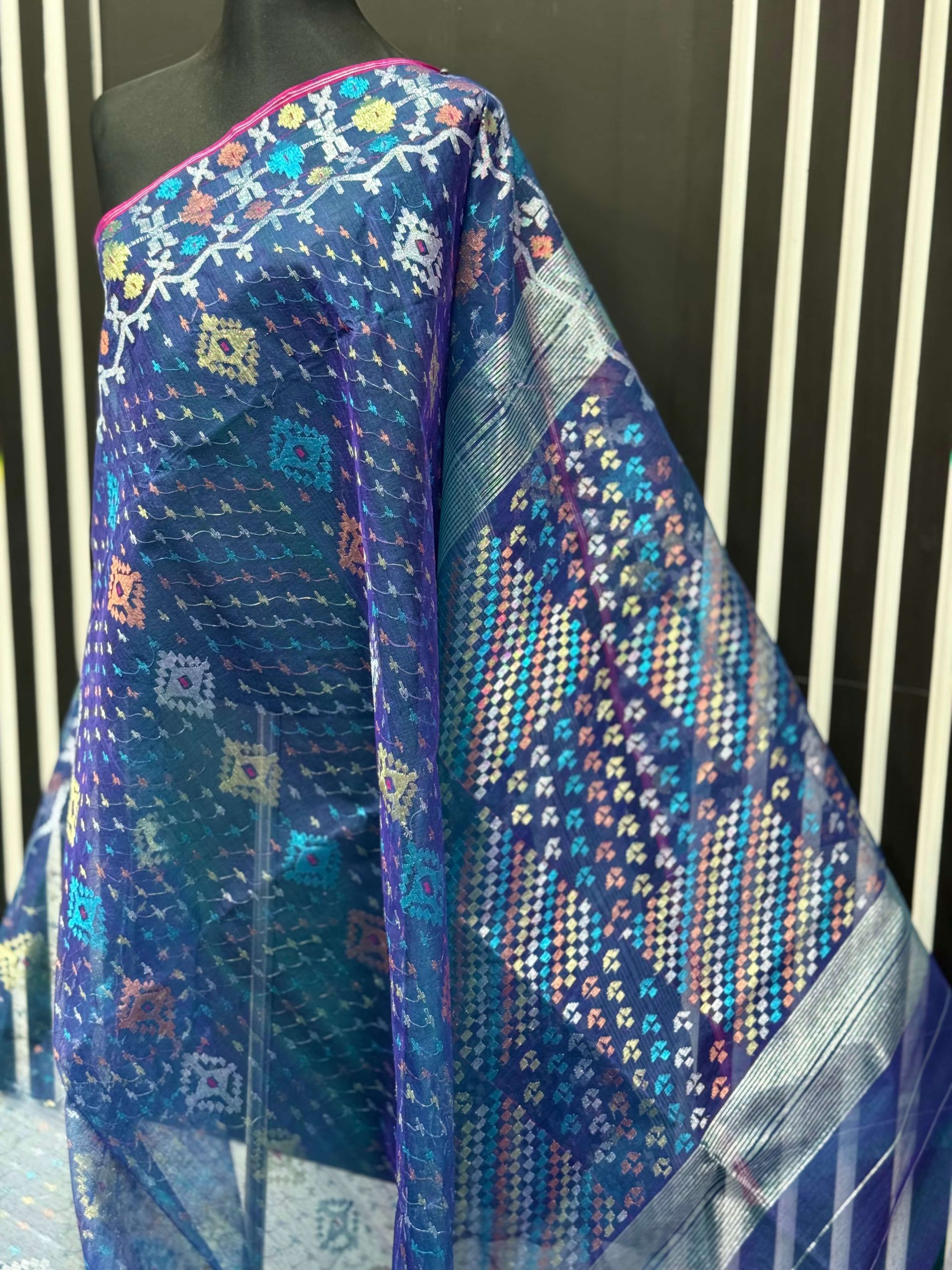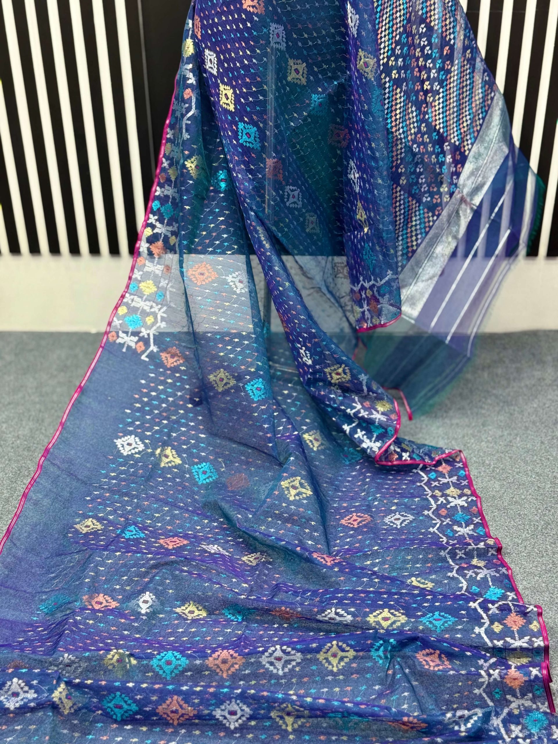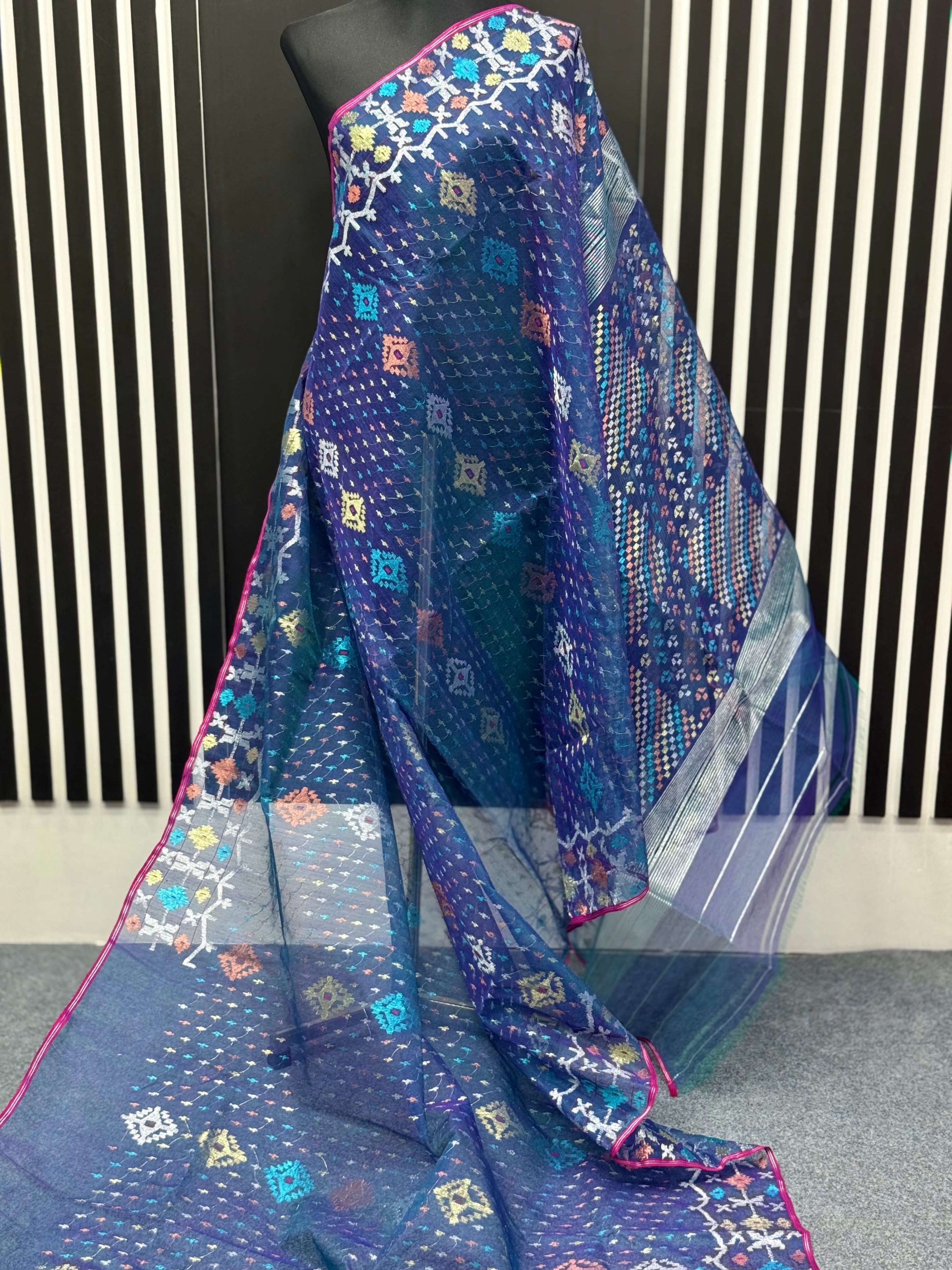 Timeless beauty in every fold! Adorn yourself in the captivating allure of Charu pallis saree. Immerse yourself in the exquisite beauty of the Dhakai Jamdani saree, a true icon of Bangladeshi heritage. Handwoven with meticulous precision, each saree showcases intricate patterns and delicate motifs, often inspired by nature and traditional designs. The fine craftsmanship and luxurious fabric make the Dhakai Jamdani a coveted choice for special occasions and everyday elegance. Metarial 👉 84 count. Half silk Color 👉 Paste Blouse 👉Yes with blouse Care 👉 Only katawash( Do it by Tati)